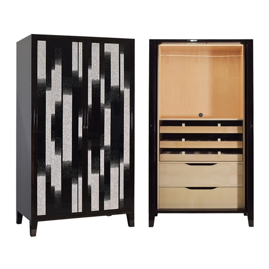 Made of solid Sycamore with straw marqueterie top, this cabinet allows you to integrate a minibar.