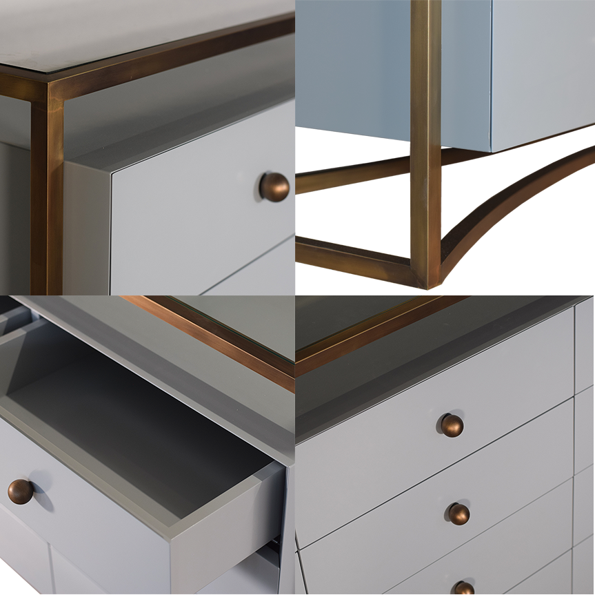 Il est réalisé avec une structure en inox et les tiroirs sont laqués en finition Vanilia.